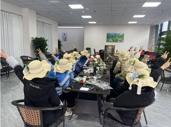 上午11時,創(chuàng)意手作環(huán)節(jié)在藍鼎茶坊開展,F(xiàn)場備有純色草帽及永生花、絲帶等裝飾材料,女員工們精心挑選花材,巧妙構(gòu)思造型:有的將向日葵與康乃馨錯落點綴成環(huán)形花冠,有的用絲帶編織出立體蝴蝶結(jié)裝飾。大家邊制作邊交流配色心得,互相挑選合適的花朵、協(xié)助粘貼花材。“通過團隊協(xié)作完成作品,讓我們感受到了自己動手創(chuàng)造帶來的快樂。”一位參與者如是說。